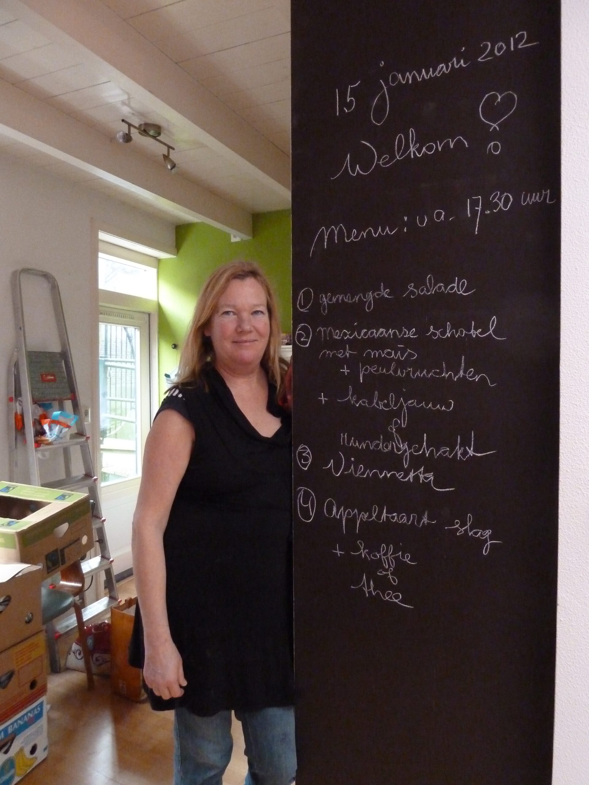 Op dit later blauw geverfde krijtbord zien we in Anita’s eigen handschrift het uitgebreide en verrukkelijke menu van die dag, 15 januari 2012, ter gelegenheid van haar 54ste verjaardag.