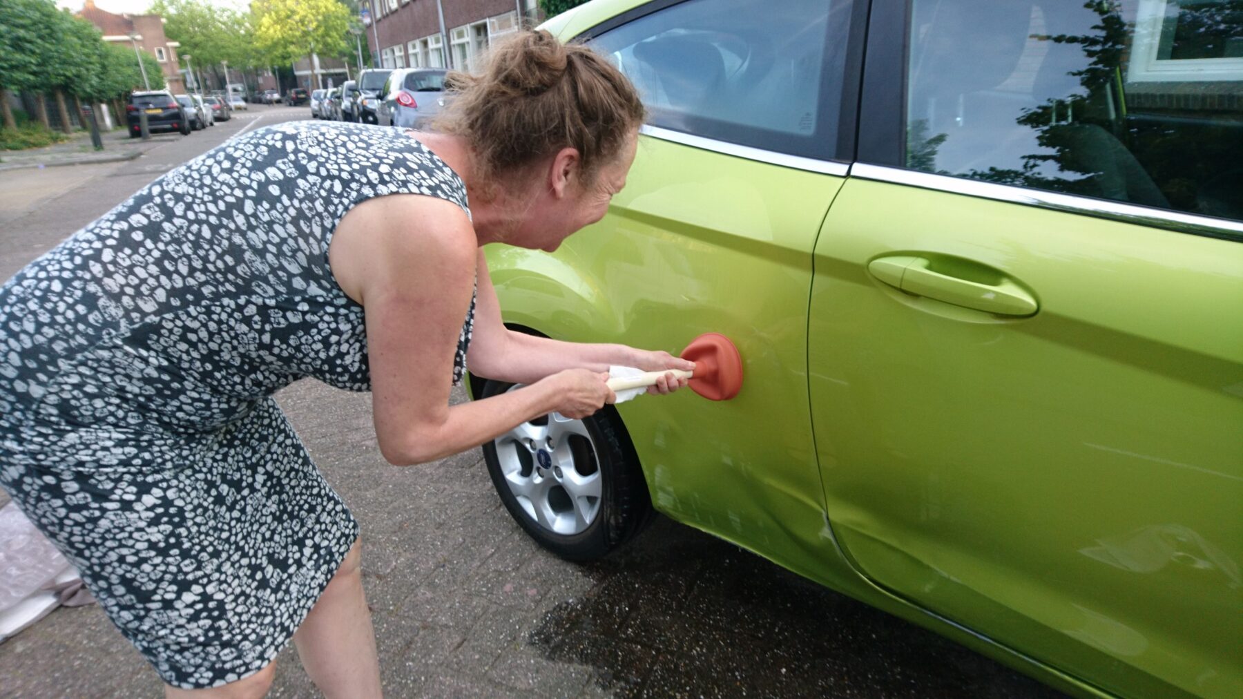 Iedere zomer pasten Anita en ik een week of twee op het huis van onze lieve vrienden Rola en Edward Hulsbergen aan de Voorwillens. Het bruggetje naar het erf had een wit geverfde metalen leuning en door iets te krap sturen zat een afdruk van de leuning in de zijkant van Anita’s groen metallic Ford Fiesta. Om mij de deuk niet te laten ontdekken probeerde Anita deze zelf creatief uit te deuken met wat lauw water en een gootsteenontstopper, geleend van overbuurvrouw en kunstenaar Claudia Huft.