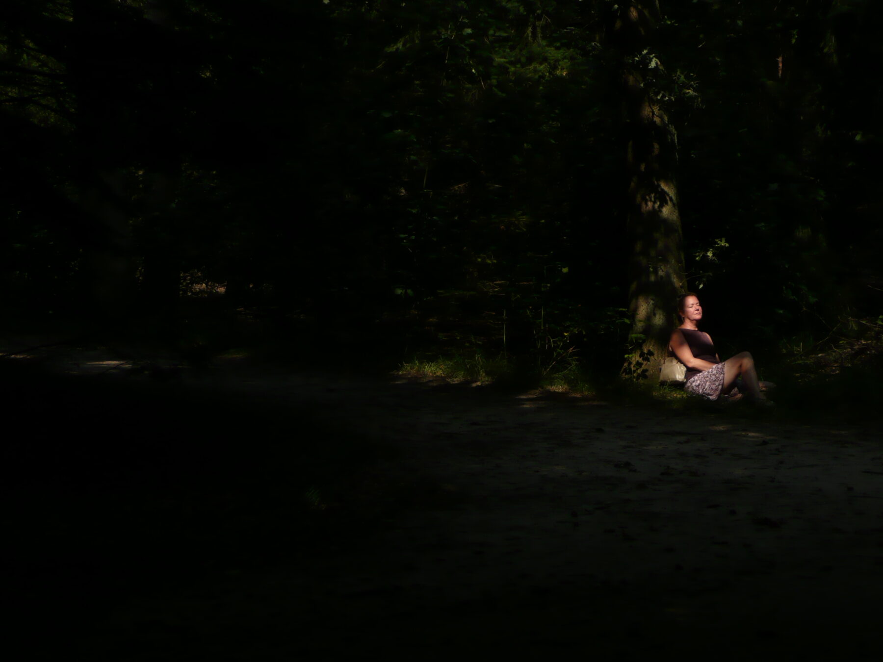 Anita geniet van het zonnetje in het Sterrebos tijdens een bezoek aan ‘Lustwarande’, een hedendaagse kunstexpositie op locatie. We hebben twee keer de in het bos, waterpartijen en op grasvelden gepresenteerde kunstwerken bekeken. Het was in de zomer en zonnig. Anita hield van de zon op haar gezicht.